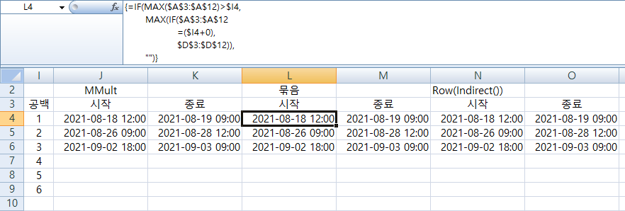 그리고 이번엔 별도 셀이나 열을 사용하지 않기 위해 굳이(?) 복잡한 수식으로,