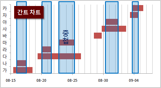 간트 차트를 통해 어느 일시에 겹치는지 쉽게 파악되는데