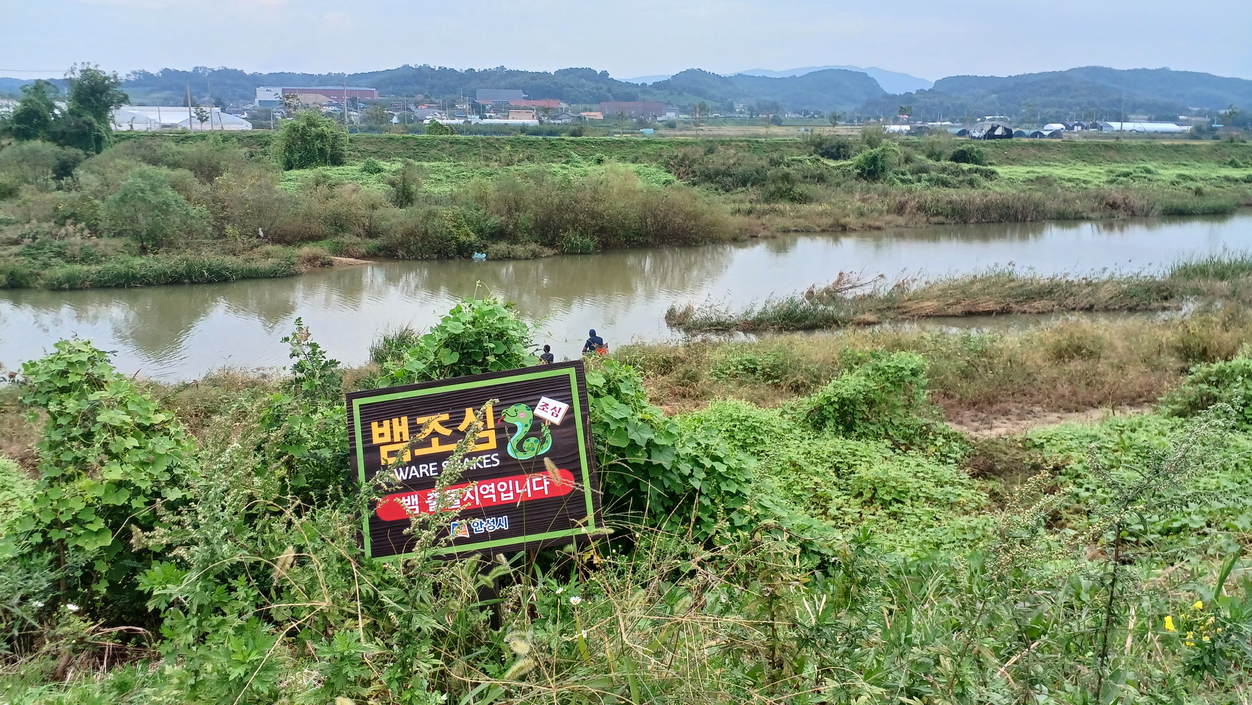 뱀조심이라는 푯말이 있는데 어린 아들과 함께 낚시하는 아빠?