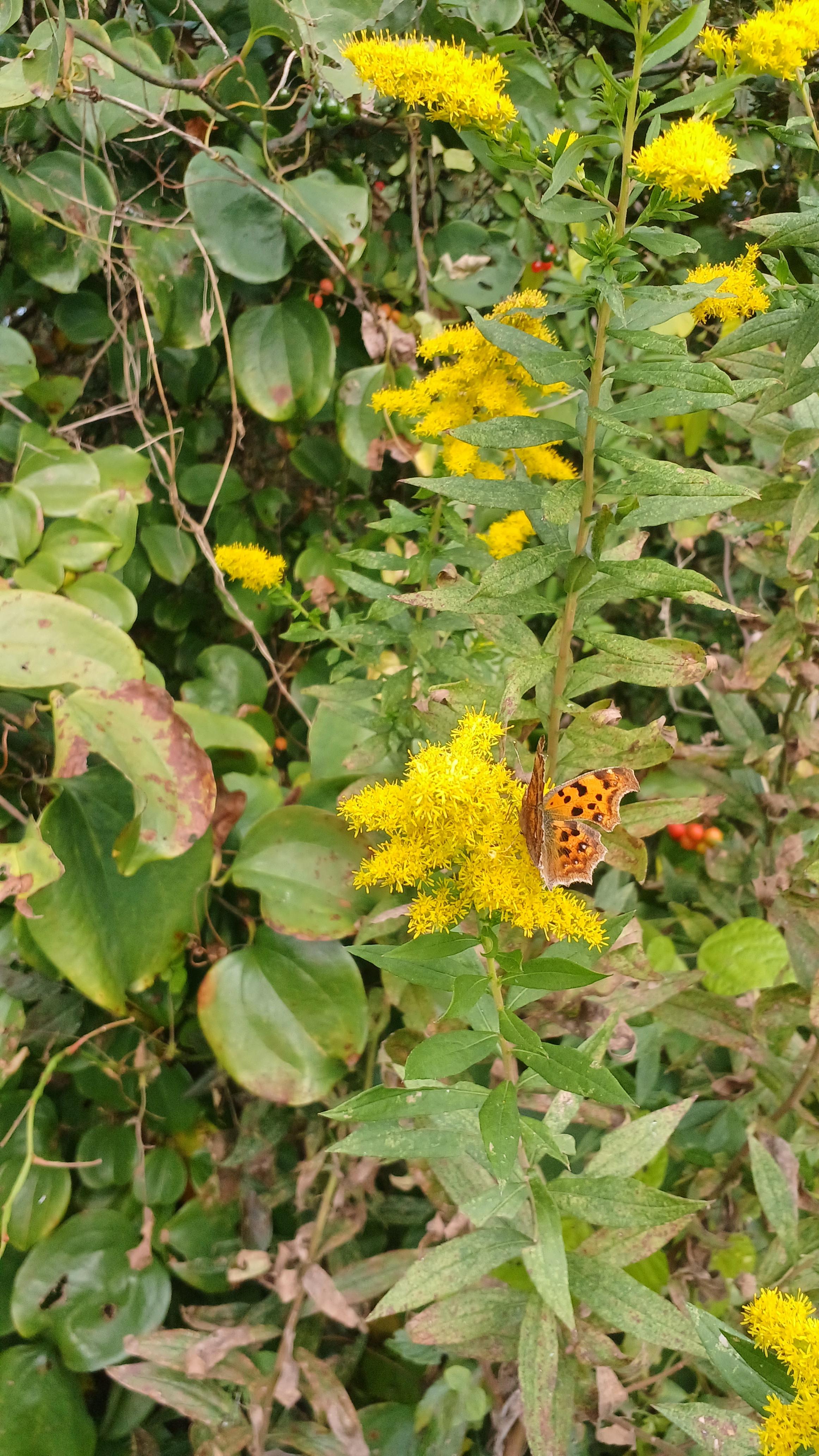 어느 시골집 화단에 풀이 우거져 있는데 좀 커 보이는 열매가 매달려 있어