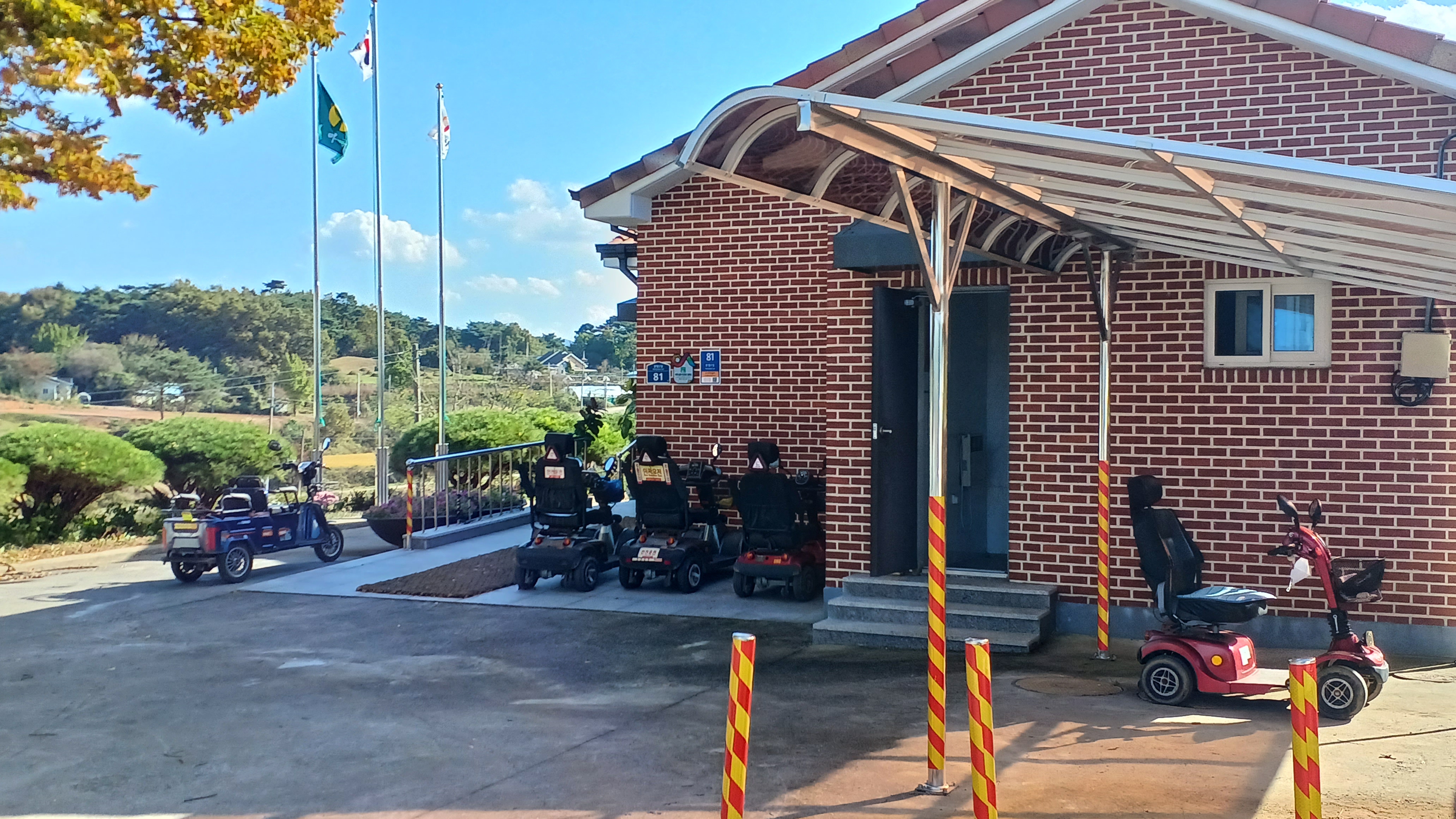 마을회관 앞에 전동 휠체어가 주체되어 있는 모습.