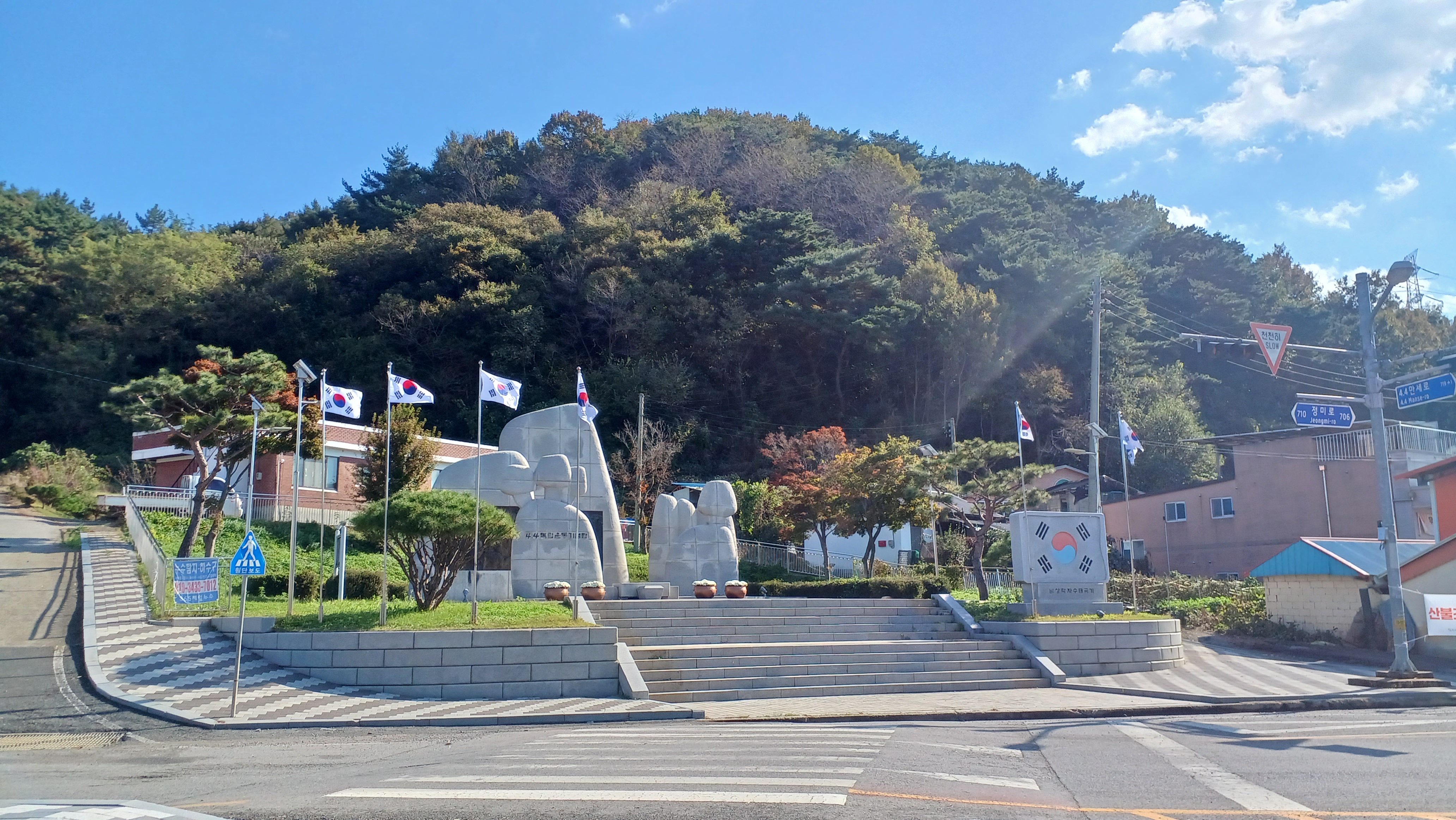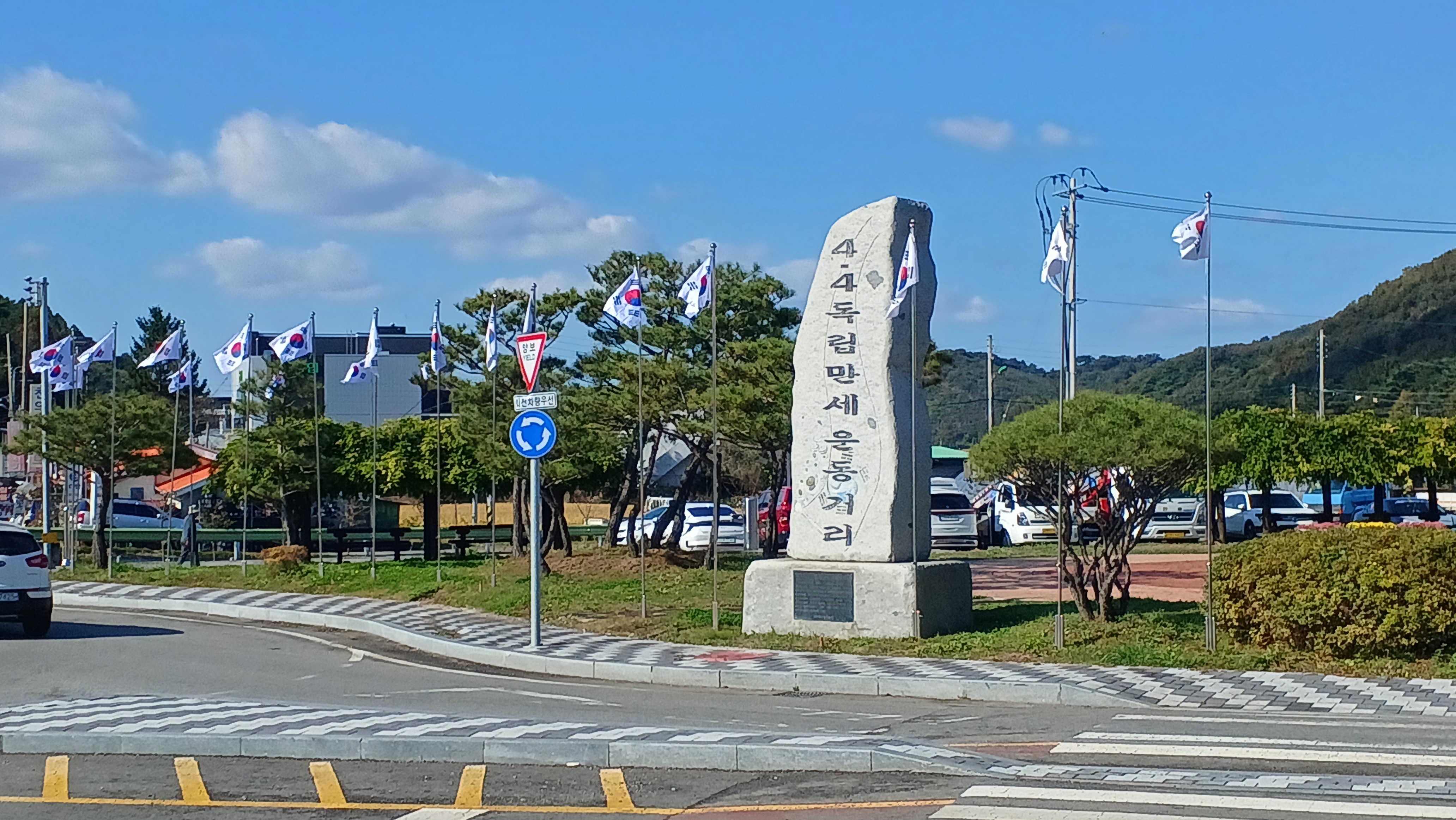 주변에 태극기가 펄럭이고 기념석도 보이네, 뭐지?
