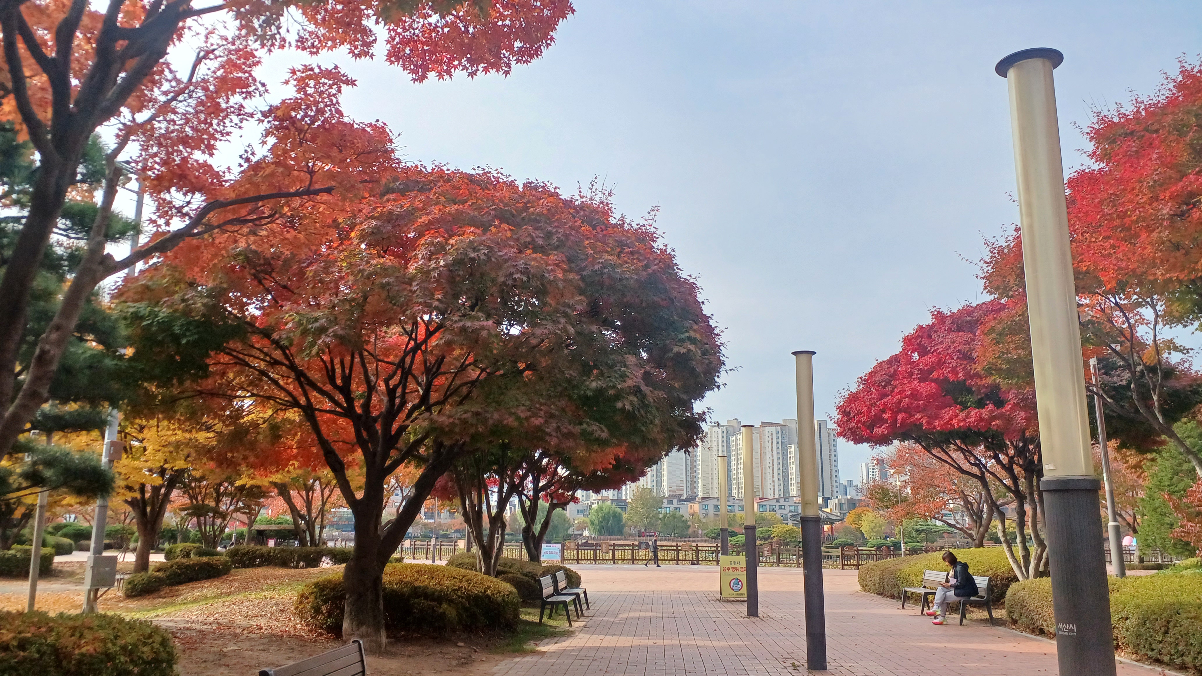 빨갛게 물들어 가는 단풍나무를 지나 호수가 나타나고 중앙엔 정자로 이어지는 다리도 있다.