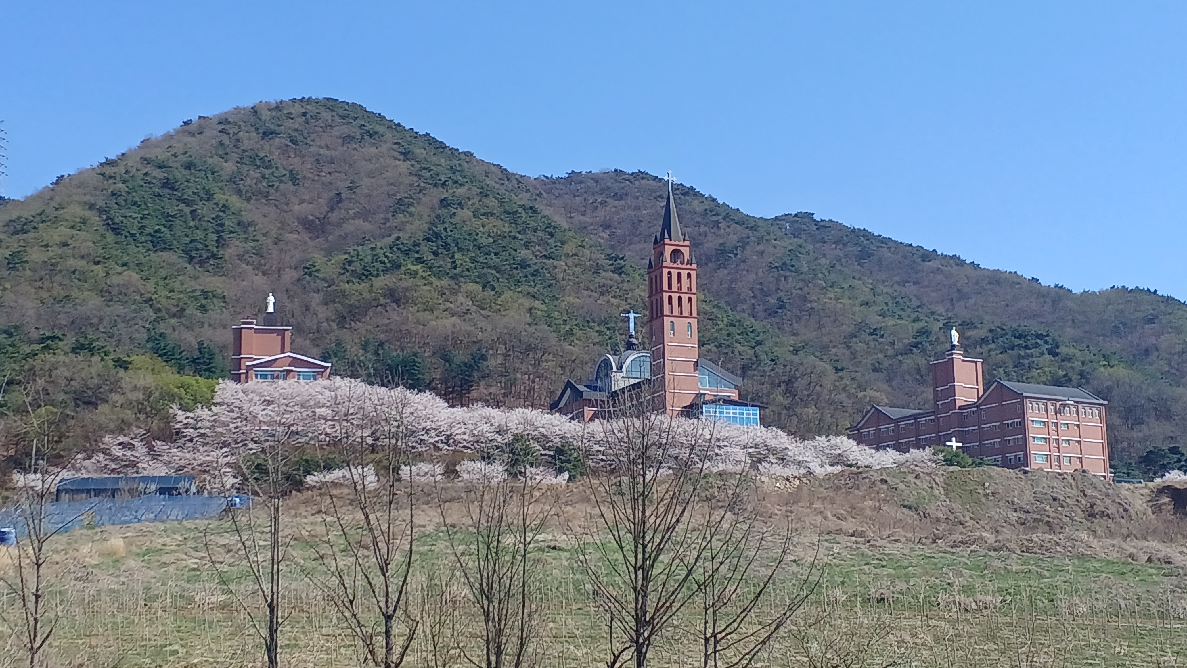 저 멀리 산 중턱에 첨탑이 보인다.