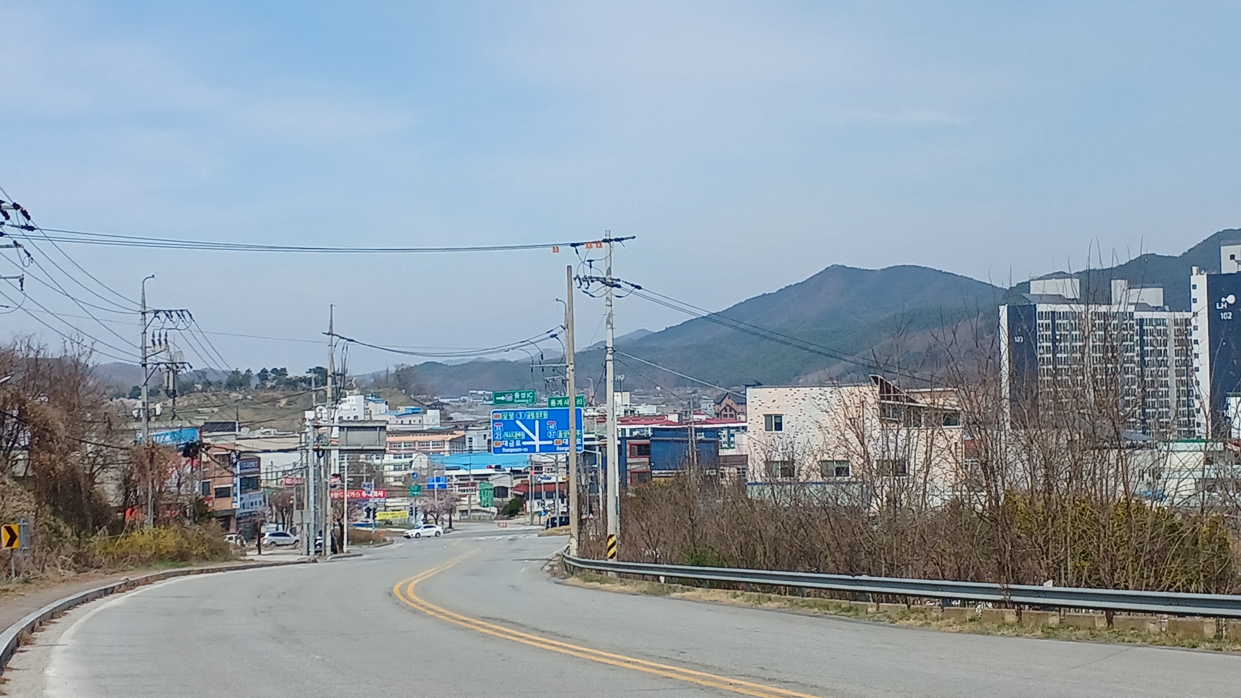 도로도 시원시원하고 건물도 말끔하고 가로수가 잘 정리되어 있고.