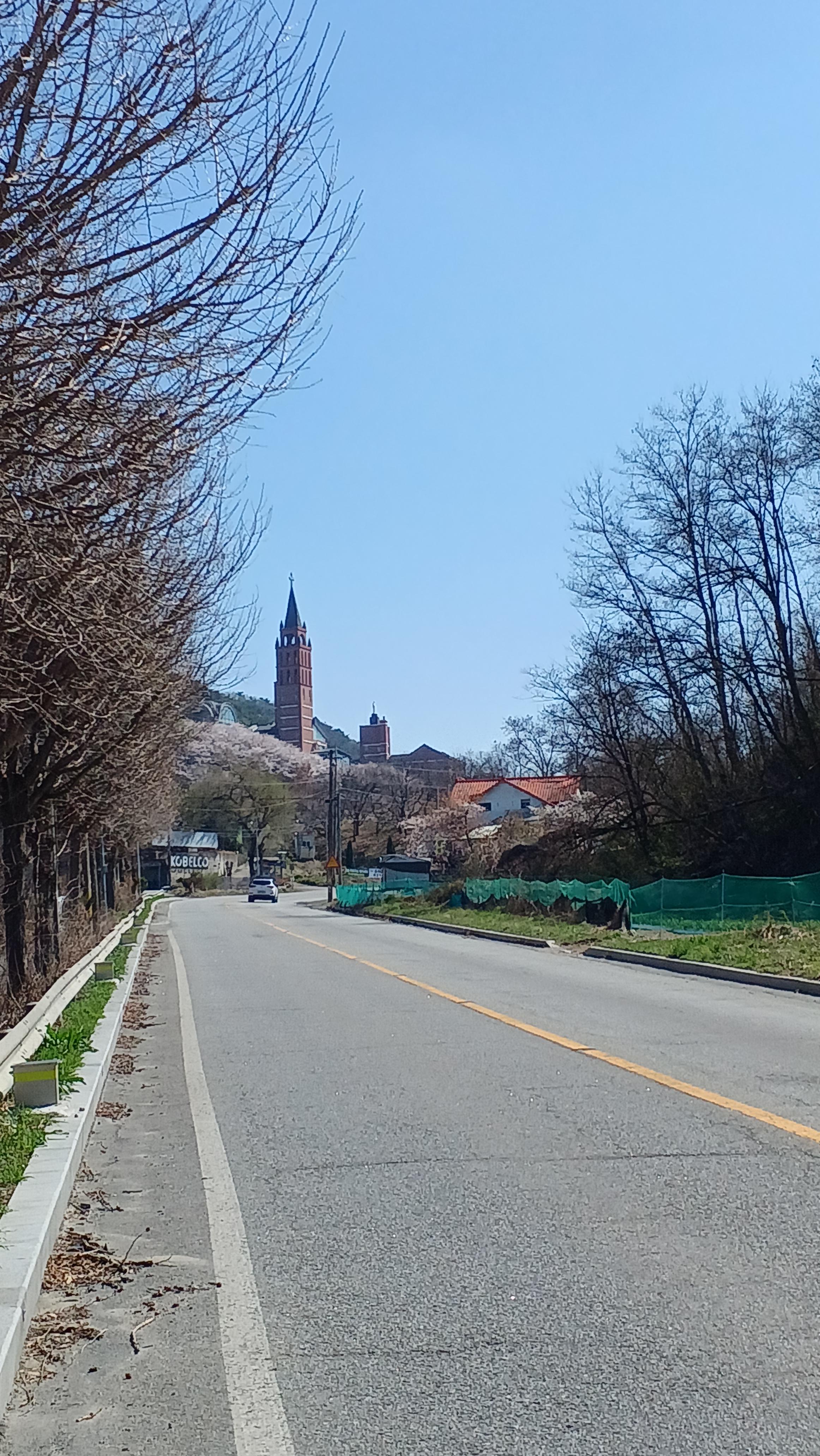 충북혁신도시를 향해 걷는데 저 멀리 산 중턱에 첨탑이 보인다 본문
