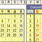 보통은 해가 바뀔 때 달력을 보여주는데... 그냥 생각난 김에 만들어 봤다. 눈썰미가 빠른 이라면, UI가 엑셀과는 다르게 느껴질 것이다. 혹시 엑셀2000 ...은 아니고 오픈오피스의 캘크다. e6 셀 (수식) =IF(AND((ROW(A1)-1)*7-WEEKDAY(DATE($A$2;$B$2;1);1)+COLUMN(A1)+1>0;(ROW(A1)-1)*7-WEEKDAY(DATE($A$2;$B$2;1);1)+COLUMN(A1)+10;INT(((MIN(E6:K6)-1)+7-WEEKDAY(DATE($A$2;$B$2;MIN(E6:K6));1))/7)+1;"") 수식으로 처리하면 위에 처럼 되는데, 날짜 정보를 이용해 달력을 만든다면... 음... 같은 표가 두개다. 뭣 땀시? '날짜'와 'Current'에는 아주..